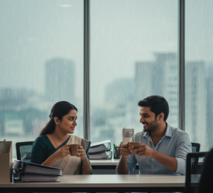 ஒரு மழை நாள் அன்று, மாலை நேரம். அலுவலகத்தில் ஊழியர்கள் குறைந்துவிட்டனர். பெரும் மழை பெய்து கொண்டிருந்ததால், அனைவரும் வீட்டிற்குச் செல்லத் தயங்கினர். மலர் தனது இருக்கையில் அமர்ந்து, புத்தகத்தைப் படித்துக் கொண்டிருந்தாள். அப்போது ஆகாஷ், இரண்டு தேநீர் கோப்பைகளுடன் வந்தான்.