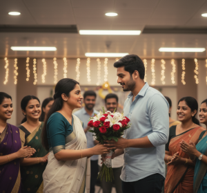ஒரு நிறுவனத்தின் ஆண்டு விழா நெருங்கியது. எல்லோரும் தயாராகிக் கொண்டிருந்தனர். மலர் வழக்கம்போல் தன்னுடன் பணிபுரியும் தோழிகளுடன் பேசிக் கொண்டிருந்தாள். அப்போது ஆகாஷ், தைரியத்துடன் மலரிடம் ஒரு மலர்க்கொத்தை நீட்டினான்.