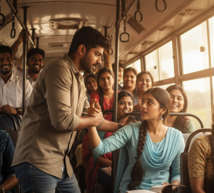 நிலா சட்டென்று சுதாரித்து, அவனைப் பிடித்துக்கொண்டாள். “பார்த்துப் போங்க,” என்று மெல்லிய குரலில் கூறினாள். ஆதவன் வெட்கத்துடன், “மன்னிக்கவும்,” என்று கூறிவிட்டு நகர்ந்தான். அந்தப் பேருந்துப் பயணம் அவர்களின் முதல் பேச்சாக அமைந்தது.