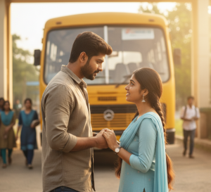 ஒரு நாள், கல்லூரிப் பேருந்து அவர்களை கல்லூரியின் நுழைவாயிலில் இறக்கிவிட்டது. அனைவரும் இறங்கிச் சென்ற பிறகு, ஆதவன் நிலாவின் கையைப் பற்றினான். “நிலா, இந்தக் கல்லூரிப் பேருந்து நம் இருவரையும் ஒரே இடத்திற்குக் கொண்டு வந்துவிட்டது. இனி என் வாழ்நாள் முழுதும் நீயே என் துணையாகப் பயணிக்க வேண்டும்,” என்று தன் காதலை வெளிப்படுத்தினான்.